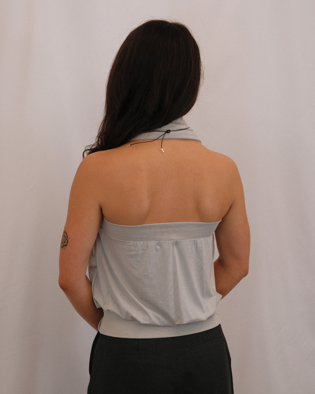 A modern statement piece with effortless versatility. Draped in a fluid design, it features a halter neckline and layered construction that reveals a built-in bandeau. The bandeau can be worn higher for coverage or lowered to show more skin, allowing you to adapt the look to your mood or occasion.